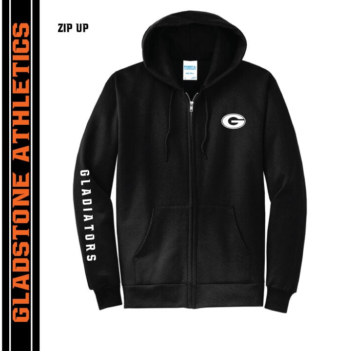 Black Hoodie or Zip, G lc, gladiator sleeve, back athletics g, White ink screen print or HT